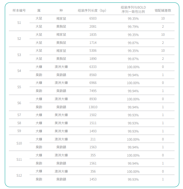 以12例病媒模擬樣本為例(含6例DNA樣本、6例RNA樣本),采用華大智造病媒測(cè)序組合產(chǎn)品,對(duì)病媒物種及其攜帶微生物的類型進(jìn)行精準(zhǔn)識(shí)別。識(shí)別結(jié)果包括但不限于:病媒物種識(shí)別結(jié)果、病媒生物線粒體組裝序列深度分布圖、病媒所攜帶的微生物類型識(shí)別等。這些結(jié)果的輸出,對(duì)于海關(guān)工作人員而言,可以精準(zhǔn)判斷病媒物種及其攜帶微生物類型,以快速應(yīng)對(duì)境外突發(fā)公共衛(wèi)生事件。