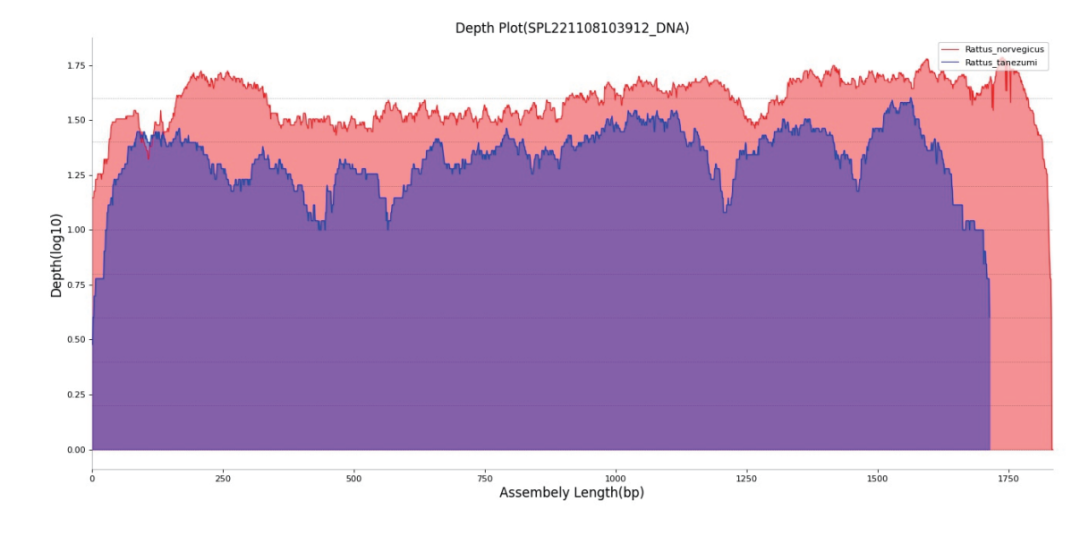 該組合產(chǎn)品可對(duì)每份樣本中比對(duì)到物種線粒體基因組的序列進(jìn)行組裝,再將組裝后的序列中比對(duì)到數(shù)據(jù)庫(kù)中的COI參考序列做深度分析,以S2樣本為例,深度分布如圖1所示。