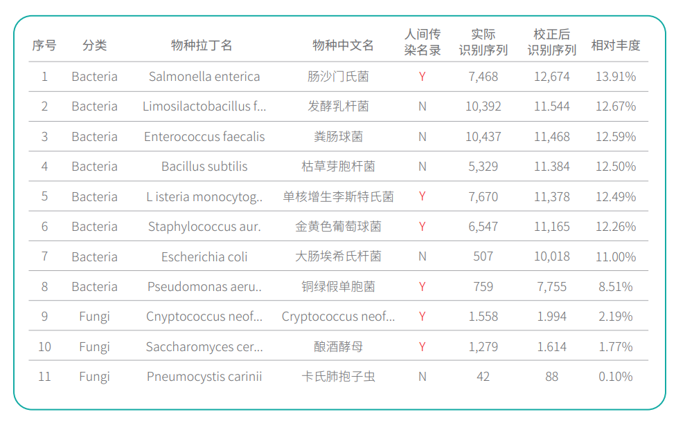 對(duì)樣本中所攜帶的微生物物種進(jìn)行識(shí)別,以S1樣本為例,結(jié)果如表2所示,識(shí)別結(jié)果符合預(yù)期,目標(biāo)微生物均被識(shí)別出,其他非目標(biāo)微生物為病媒樣本自身攜帶的其他微生物。