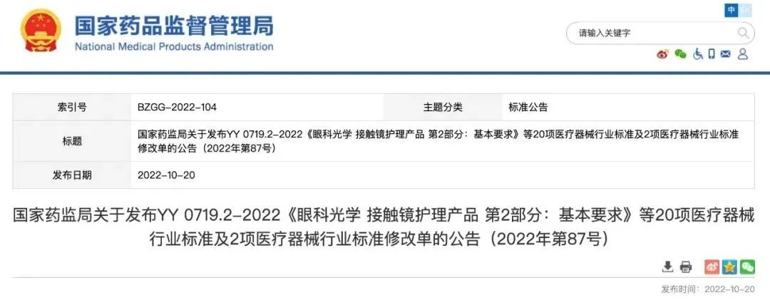 1. 國家藥品監(jiān)督管理局:國家藥監(jiān)局關(guān)于發(fā)布YY 0719.2-2022《眼科光學(xué) 接觸鏡護(hù)理產(chǎn)品 第2部分:基本要求》等20項(xiàng)醫(yī)療器械行業(yè)標(biāo)準(zhǔn)及2項(xiàng)醫(yī)療器械行業(yè)標(biāo)準(zhǔn)修改單的公告(2022年第87號)