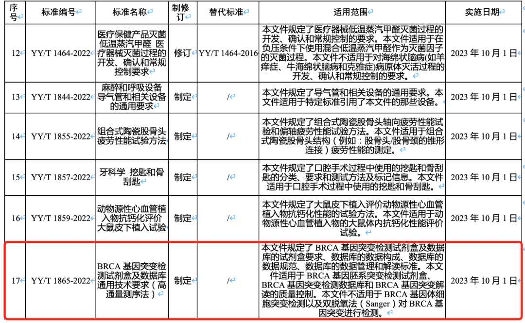 近日,國家藥品監(jiān)督管理局正式發(fā)布《BRCA基因突變檢測試劑盒及數(shù)據(jù)庫通用技術(shù)要求(高通量測序法)》(標(biāo)準(zhǔn)編號YY/T 1865-2022,下稱“該標(biāo)準(zhǔn)”)。該標(biāo)準(zhǔn)由全國醫(yī)用臨床檢驗(yàn)實(shí)驗(yàn)室和體外診斷系統(tǒng)標(biāo)準(zhǔn)化技術(shù)委員會歸口,中國食品藥品檢定研究院主導(dǎo)牽頭,深圳華大智造科技股份有限公司、北京市醫(yī)療器械檢驗(yàn)研究院等單位共同參與制定。