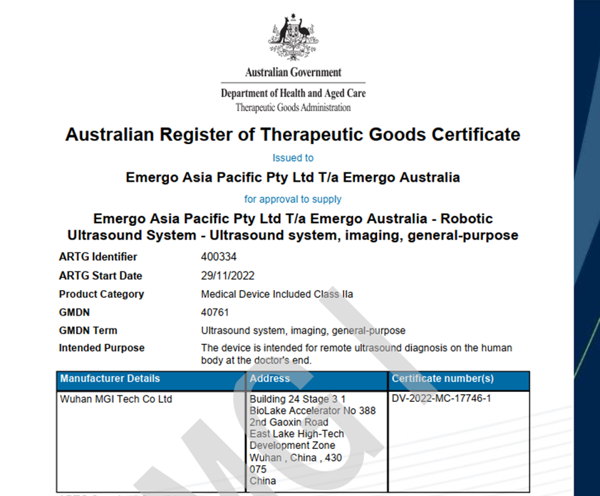澳大利亞對醫(yī)療器械的生產(chǎn)和進(jìn)口的管理極為嚴(yán)格,被公認(rèn)為是世界上管理嚴(yán)格、市場準(zhǔn)入難度較高的國家之一。此次遠(yuǎn)程超聲機(jī)器人獲得TGA認(rèn)證,一方面體現(xiàn)了華大智造遠(yuǎn)程超聲機(jī)器人相關(guān)的質(zhì)量體系和生產(chǎn)環(huán)境設(shè)施等符合澳大利亞TGA的要求;另一方面,也意味著遠(yuǎn)程超聲機(jī)器人將正式進(jìn)入澳大利亞市場銷售,進(jìn)一步將創(chuàng)新型的超聲診斷方式帶到大洋洲,為本地用戶提供新型的遠(yuǎn)程診斷工具。