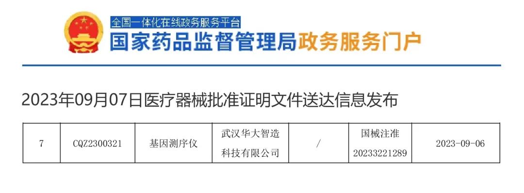 9月6日,華大智造基因測(cè)序儀DNBSEQ-G99獲批國(guó)家藥品監(jiān)督管理局(NMPA)醫(yī)療器械注冊(cè)證(國(guó)械注準(zhǔn)20233221289)。
