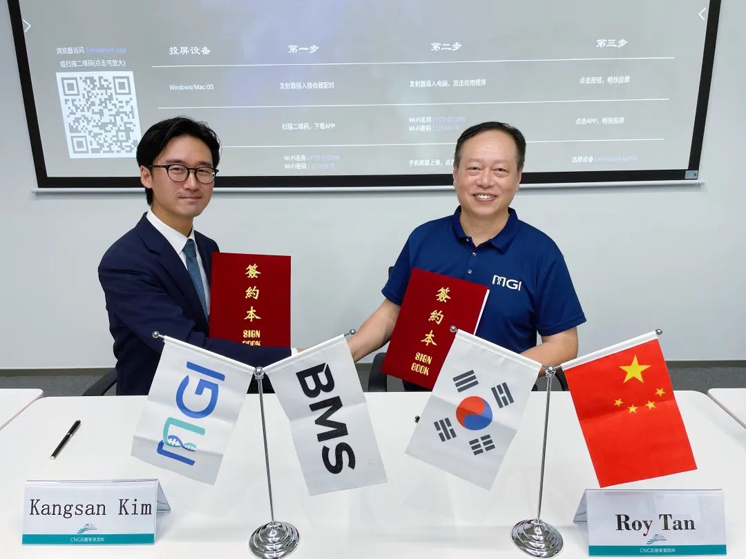 BMS公司營銷與傳播總監(jiān)Kangsan D. Kim(前左)與華大智造亞太區(qū)負(fù)責(zé)人譚宏東博士(前右)代表公司進(jìn)行簽約