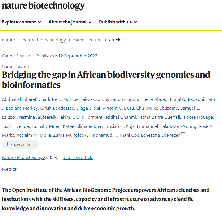 值得一提的是,9月12日Nature Biotechnology發(fā)文報(bào)道了非洲生物基因組項(xiàng)目開放研究院(African BioGenome Project (AfricaBP) Open Institute for Genomics and Bioinformatics)的成功實(shí)施。這一開創(chuàng)性的基因組和生物信息學(xué)知識交流平臺由非洲生物基因組項(xiàng)目與非洲當(dāng)?shù)貦C(jī)構(gòu)共同策劃,旨在為全非洲建立可公開訪問的線上研討會平臺,通過開展生物多樣性基因組學(xué)和生物信息學(xué)課程,增進(jìn)非洲科學(xué)家間的學(xué)術(shù)交流。