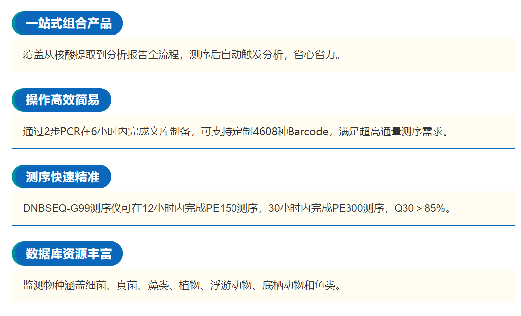 華大智造基于DNBSEQ-G99和DNBSEQ-E25測序平臺,現(xiàn)正式推出環(huán)境DNA宏條形碼測序組合產(chǎn)品,以科技之力守護生態(tài)環(huán)境。該組合產(chǎn)品結合了DNBSEQ測序技術與ATOPlex多重PCR技術,搭配自主研發(fā)的自動化樣本制備系統(tǒng)與分析軟件,可覆蓋從樣本到分析結果全流程,實現(xiàn)環(huán)境DNA一站式監(jiān)測。