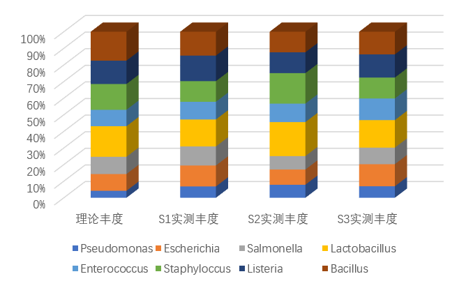 按照華大智造環(huán)境DNA宏條形碼測序組合產(chǎn)品的操作流程,采用根據(jù)已知物種構成和豐度的模擬樣本S1-S3(含8種細菌DNA標準品的混合樣本的3次重復),進行了重復性、物種檢出率以及物種豐度定量準確性三方面的對比分析。分析結果如圖1所示:預期物種全部檢出,實測豐度與理論豐度接近,3次重復差異小。