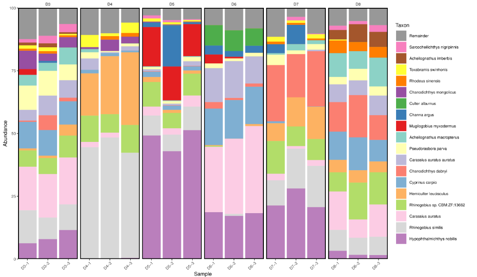 2023年6月,湖北省生態(tài)環(huán)境監(jiān)測中心站在武漢東湖6個不同點位(D3-D8)采集水體樣本,每個點位重復采樣3次,基于MGI產(chǎn)品方案進行提取、建庫、測序和分析,系統(tǒng)選取所有樣本在種分類水平上豐度排名前18的物種識別結果并生成堆疊柱狀圖,結果如圖2所示,可以看出,同一個點位的3次重復所檢測的物種構成一樣,6個點位共識別出59種魚類。