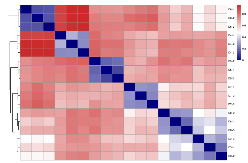 為了分析不同點位之間物種多樣性差異,系統(tǒng)可通過組間距離分析來評估不同樣本之間的物種組成差異。結果如圖3所示,橫縱坐標均為樣本,顏色反應橫向和縱向樣本間的距離??梢钥闯觯珼3和D8這2個點位在魚類物種構成上有較高的相似性,而其他點位的樣本之間的物種構成差異性比較大。