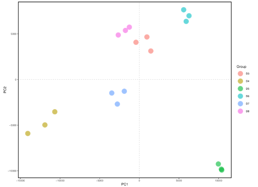 此外,系統(tǒng)還可進行主成分分析,結果如圖4所示,每一個點代表一個樣本,相同顏色的點來自同一個分組,兩點之間距離越近表明兩者的差異越小??梢钥闯?,D3和D8的樣本距離較近,說明這2個點位的魚類物種構成有一定的相似性,與上述組間距離分析的結論一致。
