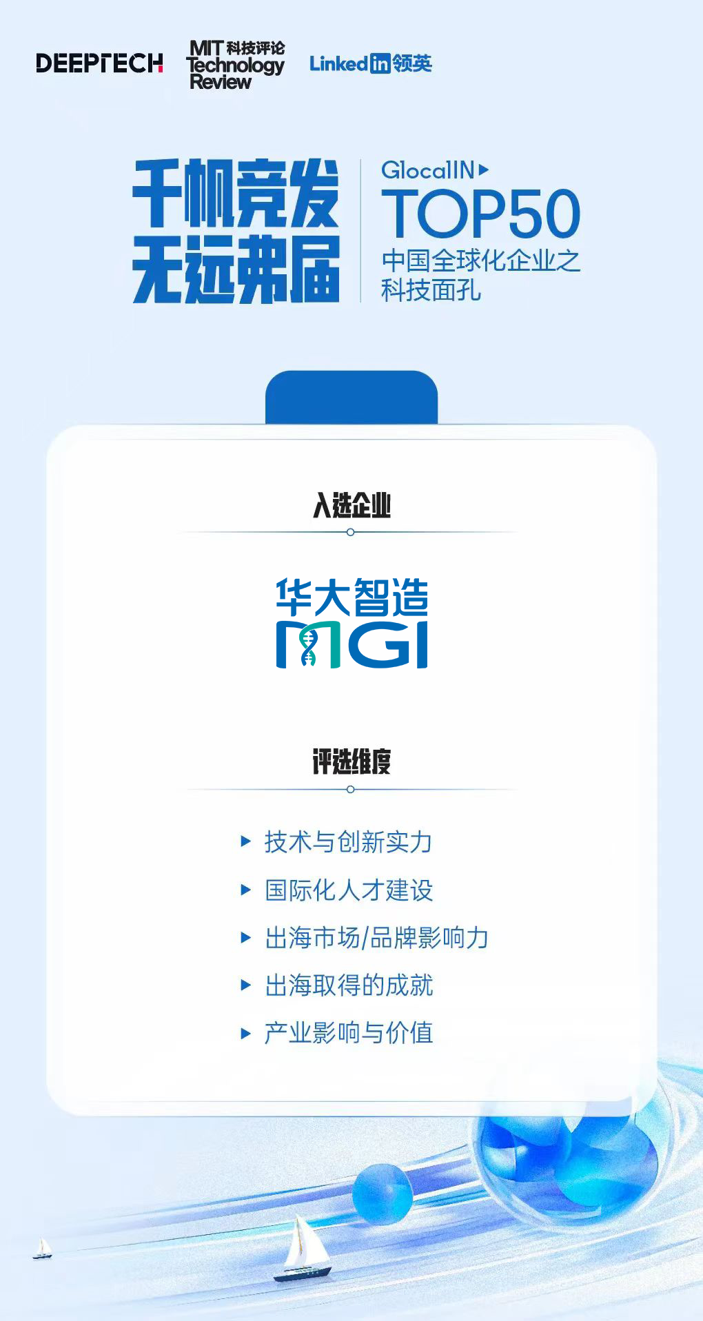 近日,《麻省理工科技評(píng)論》中國團(tuán)隊(duì)攜手 DeepTech 以及領(lǐng)英(LinkedIn)中國,正式發(fā)布「GlocalIN Top50 中國全球化企業(yè)之科技面孔」,華大智造入選醫(yī)療健康領(lǐng)域中國全球化科技企業(yè)的典型代表。
