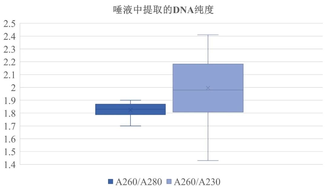圖1 隨機(jī)選擇50個(gè)健康人,進(jìn)行唾液樣本采集和DNA提取,提取性能如圖,左圖-提取產(chǎn)量,每mL唾液中,平均提取產(chǎn)量是48 μg DNA,中位值是39 μg DNA;右圖-提取純度, A260/A280=1.7~1.9;A260/A230=1.8~2.2。