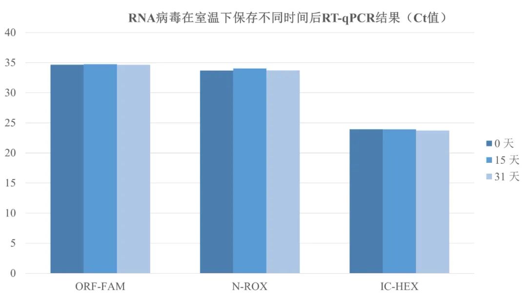 圖3 新冠RNA假病毒添加到唾液樣本中作為模擬樣本(N=10),等比例添加到MGIEasy唾液樣本采集套裝中,在25℃下長(zhǎng)期保存,分別在第0天,15天和31天取部分樣本進(jìn)行病毒核酸提取,和RT-qPCR檢測(cè)。比較3個(gè)時(shí)間點(diǎn)的Ct值,保持不變。說明RNA病毒在25度下可以長(zhǎng)期保存。
