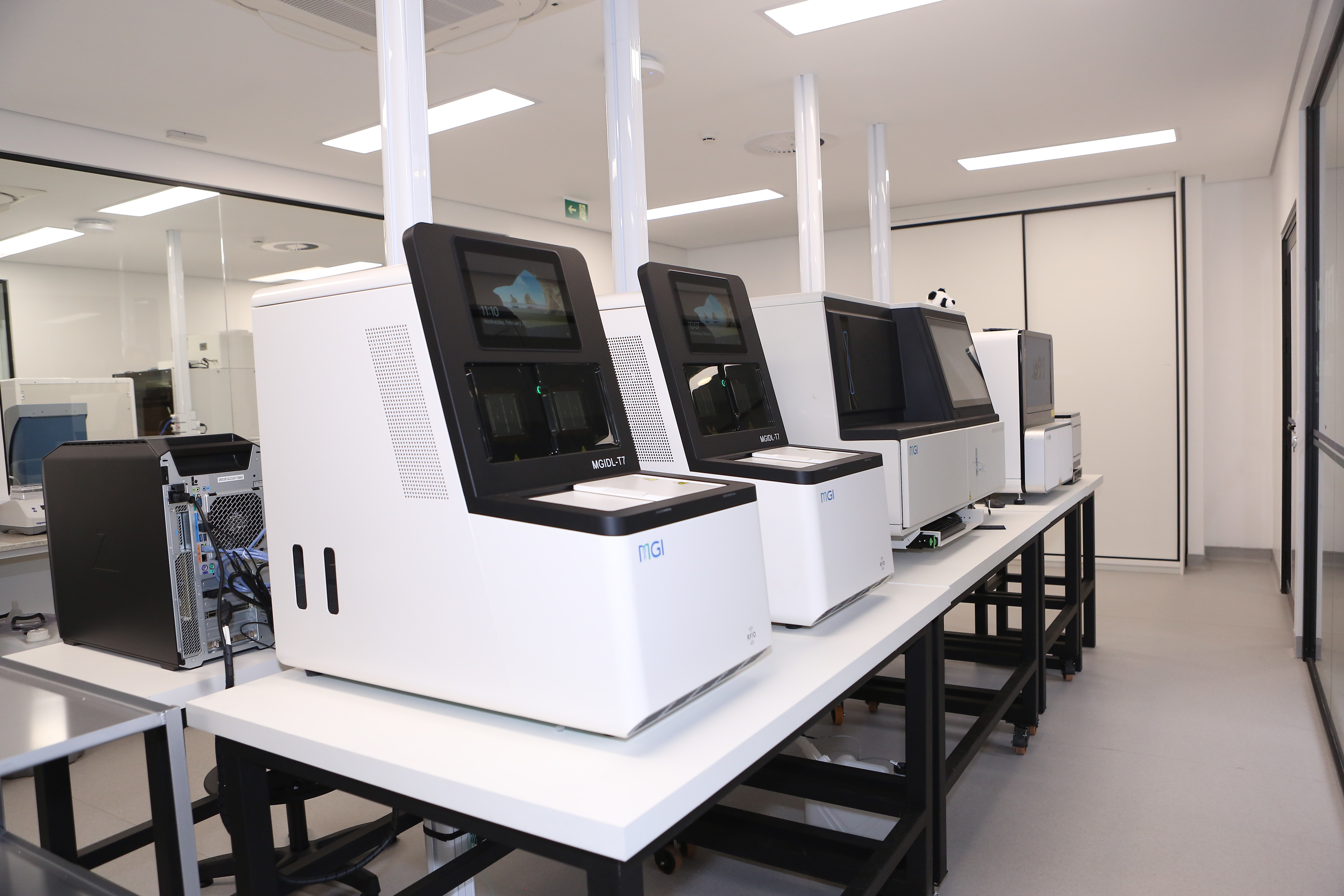 中心配備了華大智造全套產(chǎn)品組合,包括超高通量基因測(cè)序儀DNBSEQ-T7、高通量基因測(cè)序儀DNBSEQ-G400(中國(guó)境內(nèi)名稱為MGISEQ-2000)、中小通量基因測(cè)序儀DNBSEQ-G99、小型化基因測(cè)序儀DNBSEQ-E25、自動(dòng)化樣本制備系統(tǒng)MGISP-100和MGISP-960、全自動(dòng)核酸提取純化儀MGISP-384和MGISP-NE32、全自動(dòng)MGISTP-7000分杯處理系統(tǒng)、數(shù)據(jù)存儲(chǔ)及分析服務(wù)器ZTRON Pro、生信分析加速模塊MegaBOLT。