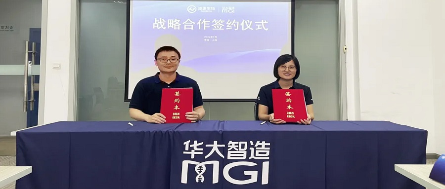 7月17日,上海凌恩生物科技有限公司(以下簡稱“凌恩生物”)與華大智造達成戰(zhàn)略合作,凌恩生物正式引進華大智造DNBSEQ-G99、DNBSEQ-T7、DNBSEQ-E25三款測序儀、DNBelab C系列單細胞測序平臺等?;诖舜魏献?,雙方將實現(xiàn)平臺與技術優(yōu)勢互補,進一步拓展高通量測序服務范圍,滿足用戶對測序服務平臺的多元化需求,共同推動環(huán)境DNA、農業(yè)科研及醫(yī)學健康等領域的技術創(chuàng)新和應用拓展。凌恩生物CEO陶曄與華大智造副總裁、中國區(qū)總經(jīng)理彭歡歡分別代表雙方簽署協(xié)議。