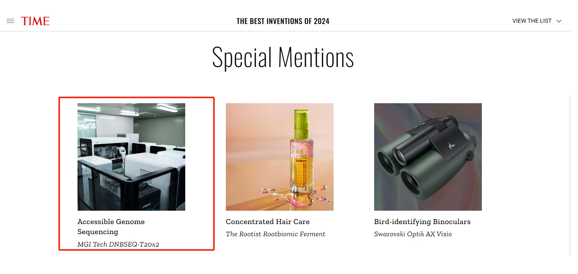 美國時(shí)間10月30日,美國《時(shí)代》雜志(TIME)在其全球官網(wǎng)上公布了2024年最佳發(fā)明獎(jiǎng)(THE BEST INVENTIONS OF 2024),華大智造的高通量測(cè)序儀DNBSEQ-T20×2(以下簡(jiǎn)稱“T20”)獲評(píng)Special Mention “特別提名”獎(jiǎng)。