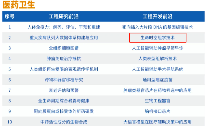 12月18日,中國(guó)工程院《全球工程前沿2024》報(bào)告在京發(fā)布。2024年度“全球工程前沿”研究按照中國(guó)工程院9個(gè)學(xué)部所屬的學(xué)科領(lǐng)域,通過(guò)數(shù)據(jù)分析與專家研判結(jié)合篩選得出。生命時(shí)空組學(xué)技術(shù)入選醫(yī)藥衛(wèi)生領(lǐng)域“工程開(kāi)發(fā)前沿”。