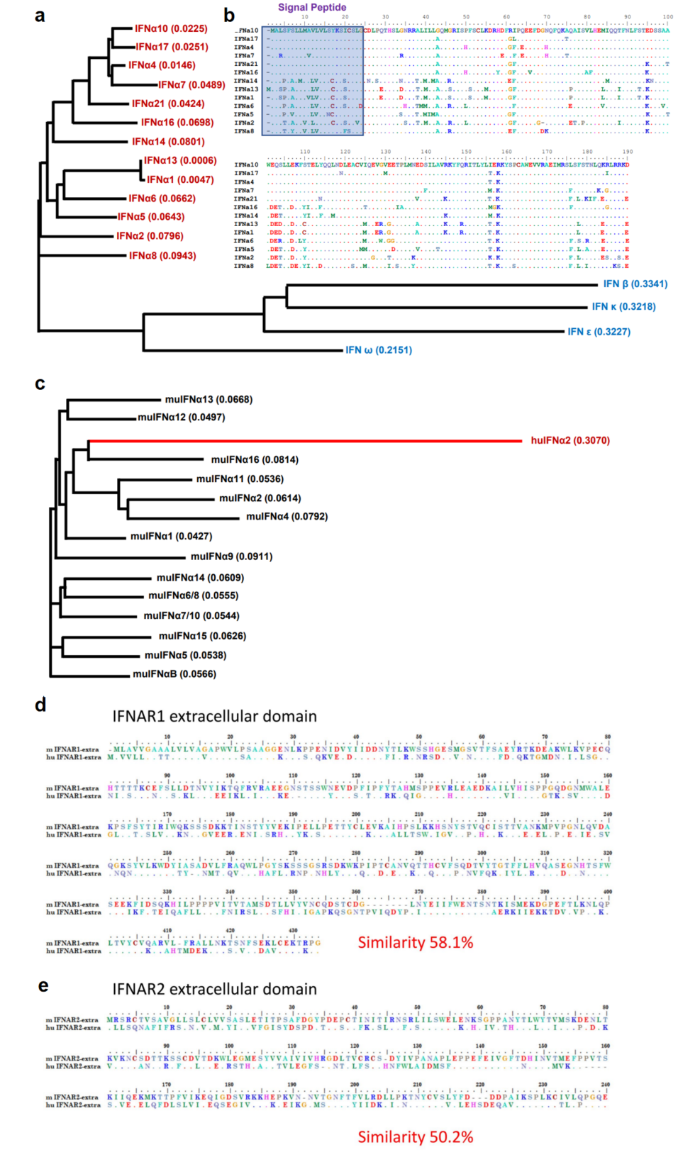 圖1:I型干擾素序列比對以及人和小鼠I型干擾素受體胞外結(jié)構(gòu)域氨基酸序列比對