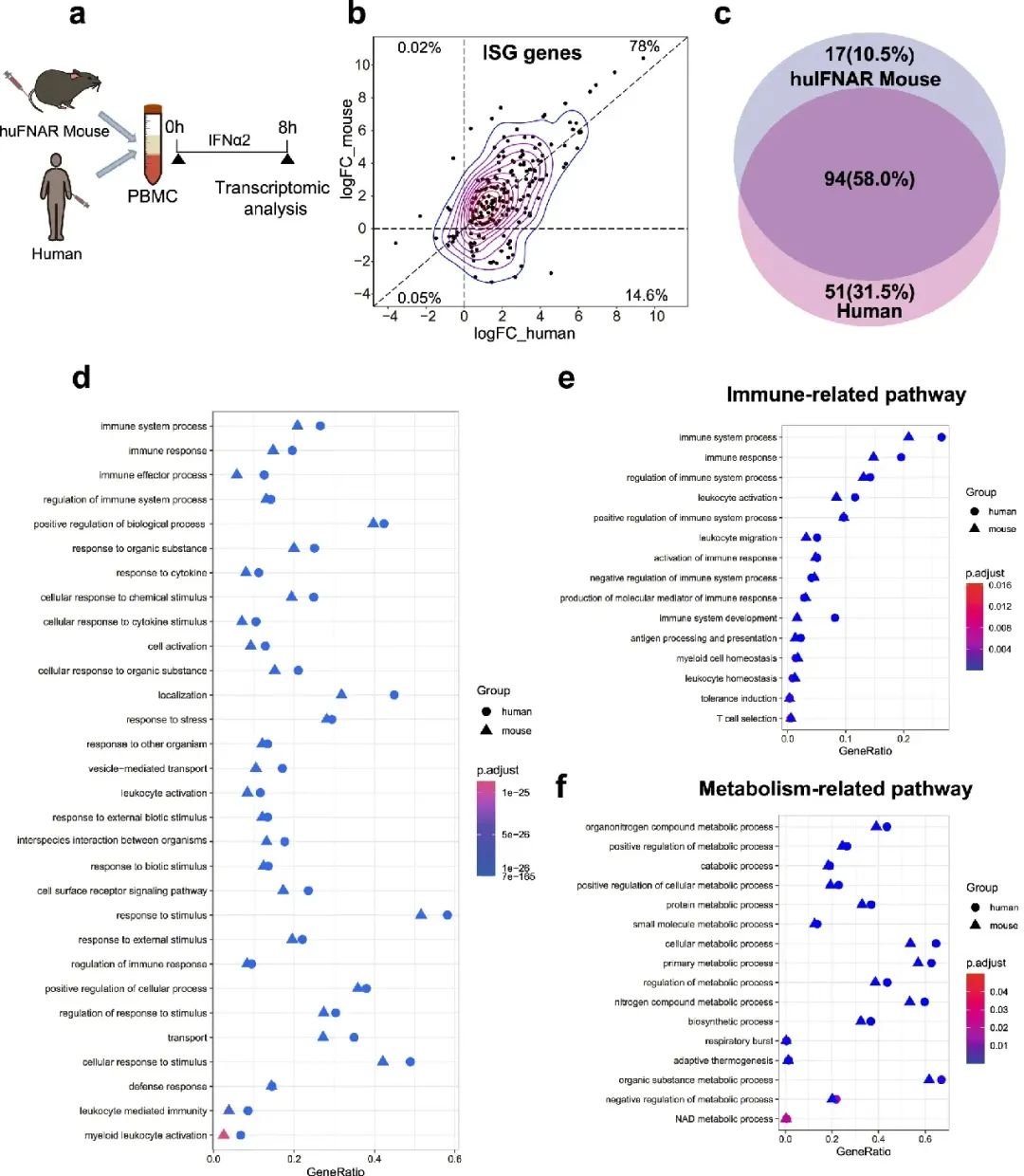 該研究首先通過基于CRISPR/cas9的敲入策略構(gòu)建了I型干擾素受體人源化小鼠(huIFNAR小鼠)。并體外通過huIFNAR小鼠和人PBMCs對人IFN刺激的基因表達(dá)譜對比實驗(圖2),證明該小鼠模型可模擬人對人源IFN刺激的免疫應(yīng)答特征,支持了該huIFNAR小鼠可作為人干擾素研究的替代模型。