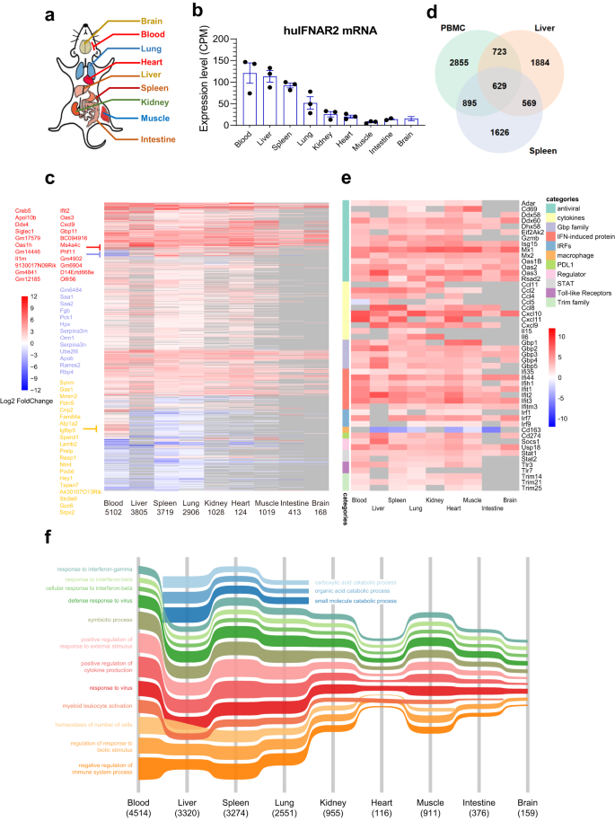 隨后,該團隊研究了腦、血、肺、心、肝、脾、腎、肌肉、腸9個主要組織對人干擾素刺激的體內(nèi)應(yīng)答圖譜。首次揭示了健康個體對人干擾素應(yīng)答的組織和器官特異性,其中,血液和肝臟免疫應(yīng)答最明顯,而腸道和腦免疫應(yīng)答最弱(圖3)。該研究所描繪的器官和組織特異性干擾素應(yīng)答圖譜尚未在健康人體中報道。