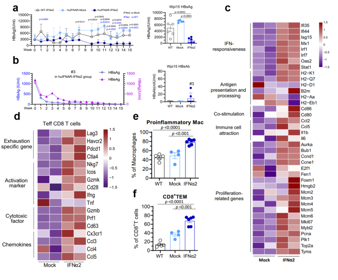 該研究成功構(gòu)建了一種能真實應(yīng)答人干擾素的huIFNAR小鼠模型,分析得到人干擾素的組織特異性應(yīng)答譜,在該小鼠模型中證明干擾素能夠降低血清HBsAg水平,并發(fā)現(xiàn)特定細(xì)胞類型可能在實現(xiàn)HBV治愈中起到重要作用。